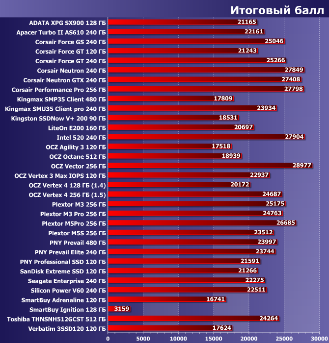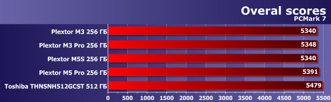 Случилось так, что сегодня у нас и PCMark7 впервые представлен всего одной диаграммой — на всех трассах разница между самым быстрым и самым медленным накопителями не превышает 10%. Такое вот поразительное единодушие, которое вылилось и в общий балл.