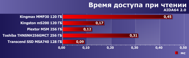...хотя иногда старички могут и побороться если не за лидерство, то, хотя бы, за почетную капитуляцию. Во всяком случае, Kingstom mS200 не слишком отстал от SSD Toshiba, относящегося к более высокому классу. С другой стороны, Transcend MSA740 его даже обогнал. А результаты Kingmax MMP30 в очередной раз показывают практически полное отсутствие способностей в работе с очередью команд, т. е. предыдущий диагноз подтвержден и другой программой.