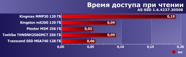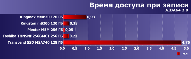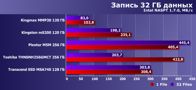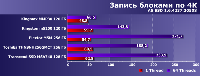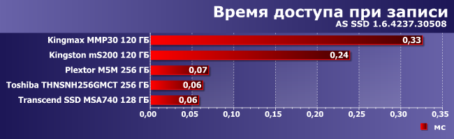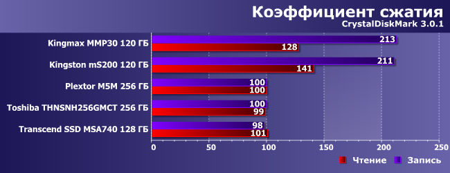 Что любопытно, Kingmax MMP30 и здесь не может похвастаться высокими результатами, несмотря на умение SF-2241 сжимать повторяющиеся последовательности данных — способность, которая выводит Kingston mS200 на первое место (вместе с SSD Toshiba). В лучшем случае он MMP30 может конкурировать с Transcend MSA740 на изначально бюджетном контроллере, так что последний начинает нам нравиться все больше и больше.