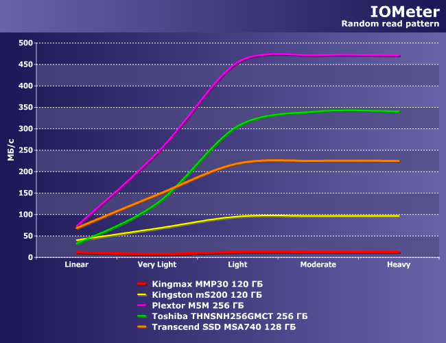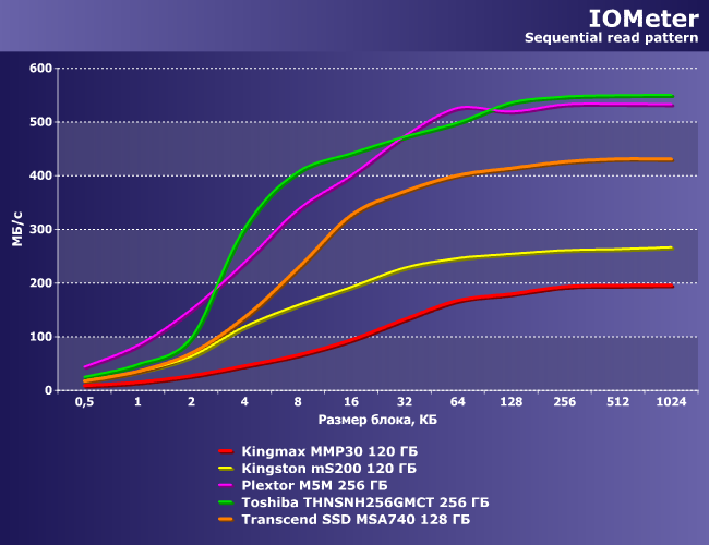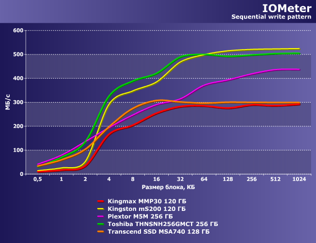 В качестве ориентира нами был взят ранее протестированный Plextor M5M 256 ГБ, благо высокопроизводительный и близкий к накопителю Toshiba по организации.