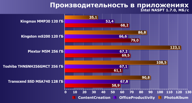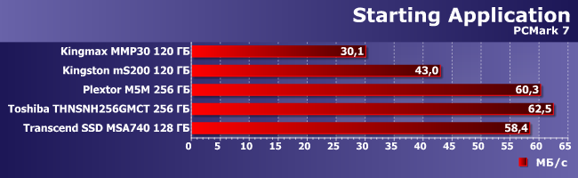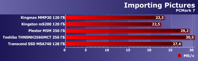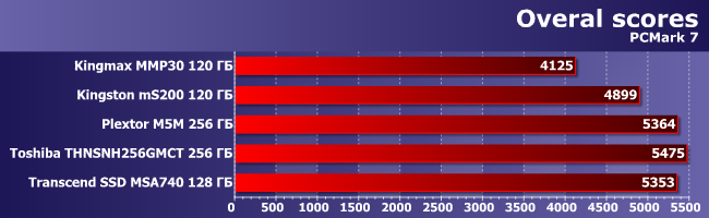 Как уже неоднократно было отмечено, общий балл PCMark7 не слишком различает разные накопители, хотя когда речь идет о слишком разных — можно увидеть и такое. Впрочем, 10% отставания от общего уровня у Kingston mS200 это нормально, а вот Kingmax MMP30, увы, заметно медленнее всех.