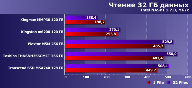 Явными аутсайдерами, как и предполагалось, оказываются SSD Kingston и Kingmax — все-таки асинхронная память в паре с уже подустаревшим контроллером на «оружие победы» не тянет. Фактически, как видим, этим устройствам даже при такой нагрузке не может пригодиться быстрый интерфейс — их собственная скорость чтения ниже ограничений SATA300. Toshiba и Plextor в лидерах, но это и ожидалось: с точки зрения организации это другой край — быстрый контроллер и быстрая память. А Transcend на JMicron — толковый середнячок.