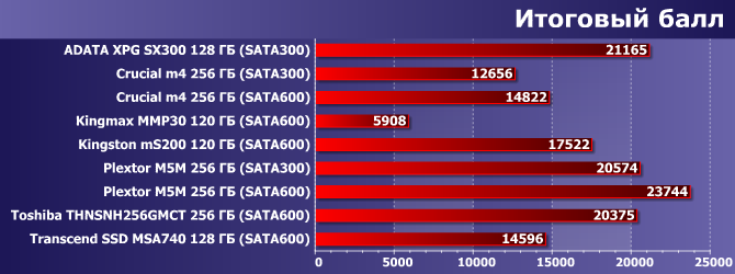 Что же касается результатов наших героев, то тут все закономерно. Только вот показатели Kingmax MMP30 пугающие, но этому есть объяснение: в подсчете общего балла участвуют и результаты тестов, сильно зависящих от операций со случайным доступом, а с этим у данного накопителя все плохо (что мы видели выше, поскольку часть результатов этих тестов представлена и на диаграммах). Впрочем, такого рода нагрузки для устройств этого класса к типичным не относятся, так что на это можно и не обращать внимания.