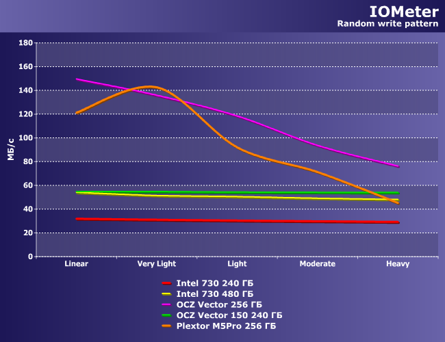 Еще интереснее положение дел с записью. Как и было обещано производителем, Intel 730 на 240 ГБ намного медленнее старшей модели, причины чего аналогичны отмеченным в обзоре Crucial M500: борьба за плотность хранения данных приводит к тому, что уже и при 240-256 ГБ суммарной емкости контроллеры зачастую работают не с полной загрузкой каналов. Во всяком случае, это верно для моделей, использующих чипы памяти на кристаллах по 128 Гбит, что следует учитывать всем сторонникам технического прогресса: самые современные модели емкостью менее 480 ГБ вряд ли удовлетворят бескомпромиссного пользователя. А вот 19-нанометровая память Toshiba чуть более архаична по организации, но и более лояльна к небольшим емкостям. Результат? Оба Vector в лидерах, Intel 730 480 ГБ сравним с ними, но немного отстает, M5 Pro уже заметно медленнее, а Intel 730 240 ГБ — явный аутсайдер.