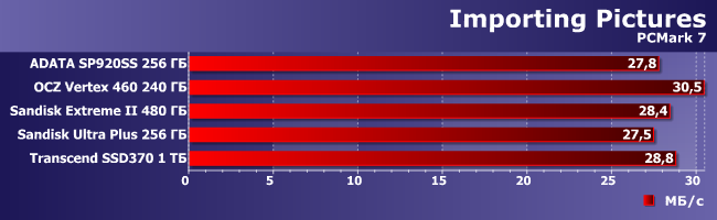 Впрочем, отдельные трассы этого теста как обычно более избирательны, нежели общий балл. В частности, сегодня обнаружился и ~10% разброс результатов при импорте картинок. Но это между самым быстрым и самым медленными накопителями, так что и мимо него можно даже пройти мимо, не заостряя внимания :)