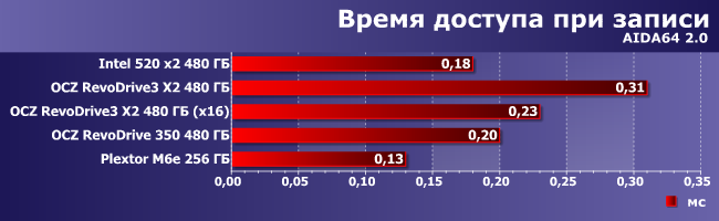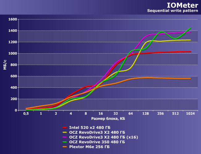 Запись — операция более сложная. Но и здесь результаты RevoDrive показательны — других способов стабильно «выжимать» на больших блоках хотя бы 1,2 ГБ/с нет.