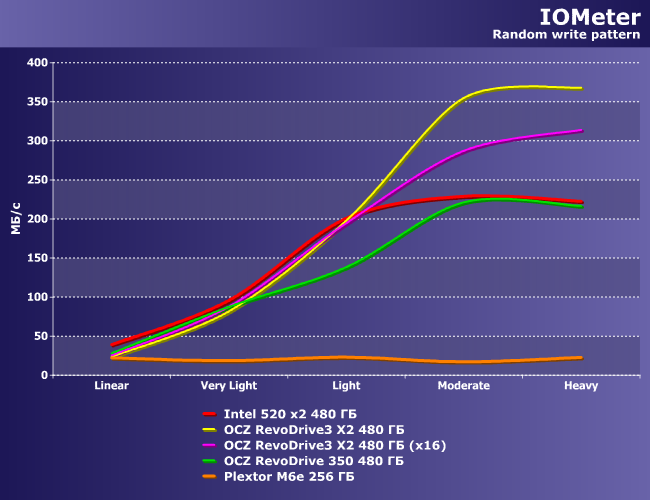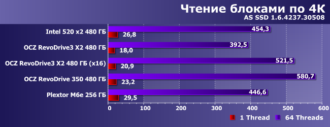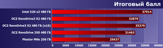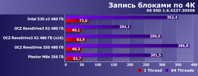 Вне досягаемости старый RevoDrive3, причем вариант с установкой в «процессорный» слот быстрее — судя по всему задержек меньше, что сказывается. Новая же флэш-память, к сожалению, не позволила RevoDrive 350 угнаться за RAID-массивом из двух SSD, зато Plextor M6e он на больших нагрузках обгоняет заметно.