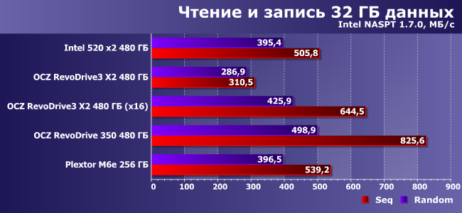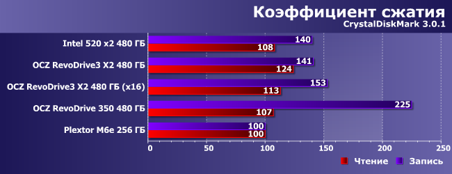 Со сжатием все ясно: SandForce умеет, прочие нет, ну а эффект для RevoDrive 350 при «отвязке от флэша» максимальный, поскольку у него самый быстрый интерфейс.