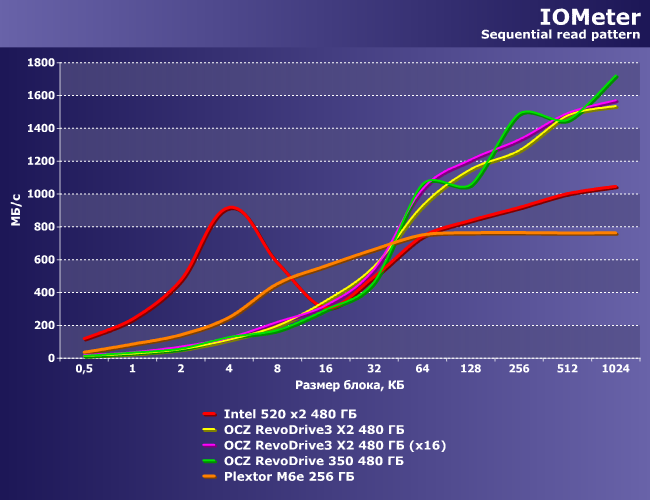 Тот самый случай, когда интерфейс оказывается определяющим. Plextor M6e как и предполагалось упирается в PCIe x2, массив из Intel 520 — в удвоенную пропускную способность SATA600, так что получить что-то большее может лишь «широкий» PCIe RevoDrive. Впрочем, х8 новой модели лишь немногим быстрее х4 старой во-первых, да и на высокие скорости можно рассчитывать лишь на блоках большого размера во-вторых.