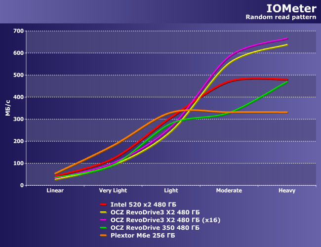Запись пропустим без комментариев — все-таки здесь сказывается сжатие, да и на современных накопителях этот шаблон IOMeter нередко ведет себя со странностями (так что пора его переработать, пожалуй).