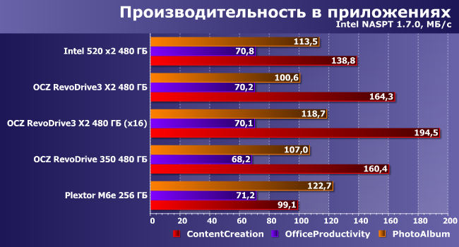 Подобным образом положение дел складывается и в NASPT — разве что в шаблоне PhotoAlbum, где есть немалое количество последовательных операциях, видно какое-никакое преимущество RevoDrive, но победителем оказалась в очередной раз более старая модель. Вообще, как уже неоднократно было отмечено, тесты высокого уровня показывают такие скорости, что интерфейс еще не скоро станет существенно-ограничивающим их фактором.
