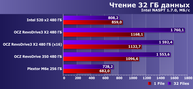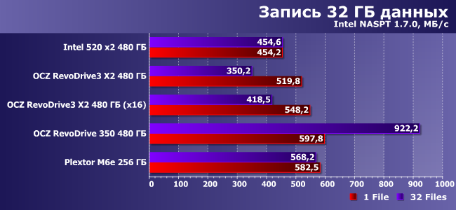 При записи разница между одним и 32 потоками хорошо заметна лишь в случае RevoDrive 350 — более старая модель весьма неубедительна. А вот новинка — хороша: почти гигабайт в секунду при реальной записи данных в несколько файлов это то, что другими способами труднодостижимо, но в ряде сфер применения может пригодиться.