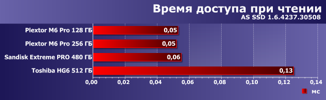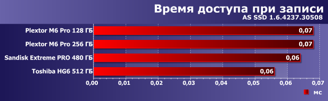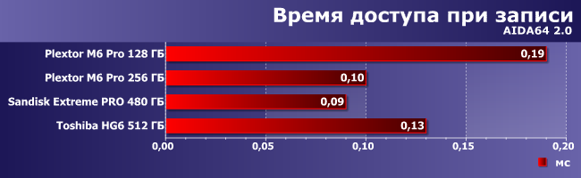 Время доступа невелико у всех испытуемых, хотя на операциях чтения хорошо заметен проигрыш Toshiba HG6, а вот при записи положение дел более разнообразное. Но, повторимся, когда счет идет на сотые доли миллисекунд, чуть быстрее или чуть медленнее уже не имеет никакого значения.