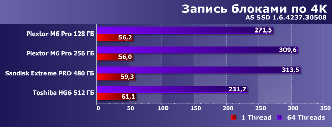 Чтение традиционно можно не комментировать, по записи же в очередной раз видим низкую производительность SSD Toshiba в многопоточном режиме — увы, но этот недостаток предыдущих поколений устройств данного производителя никуда не делся.
