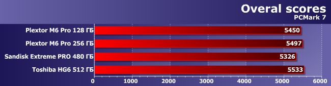 PCMark 7 традиционно считает все SSD (по крайней мере, одного класса) примерно одинаковыми — вот между ними и винчестерами разница огромная, но не внутри сегмента.