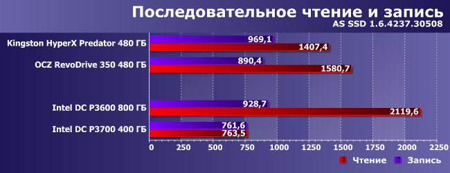 Для тестирования P3600 и P3700 нами был собран стенд на базе платформы LGA2011-3, поскольку для данного сегмента такие накопители в основном и рекомендуются. Соответственно, нам пришлось использовать довольно мощный процессор Core i7-5960X, но на результаты дисковых тестов (особенно тех, которые мы используем сегодня) это не влияет. Объем памяти на всякий случай постарались ограничить, взяв всего один модуль DDR4-2133 емкостью 4 ГБ. А для сравнения мы приведем результаты Kingston HyperX Predator и OCZ RevoDrive 350, как раз недавно протестированных в «стандартных» условиях.