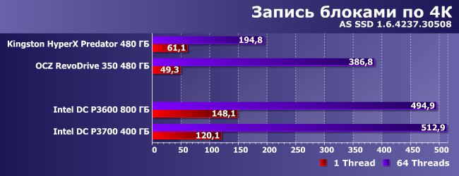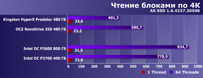 А что со случайным чтением блоками по 4К, которое как раз обещали ускорить? Вот здесь — показательно: действительно стало заметно быстрее, даже если сравнивать наших героев с OCZ RevoDrive, по сути своей являющимся массивом RAID0 из четырех SSD. Predator же еще медленнее — в его случае отставание от DC P3600 более чем двукратное (формально более быстрому Р3700 продолжает мешать низкая емкость флэш-памяти).