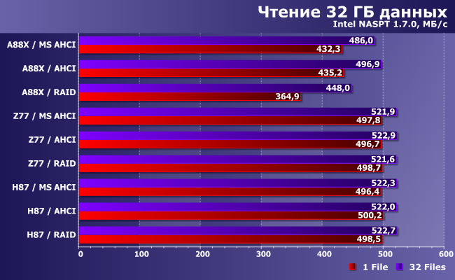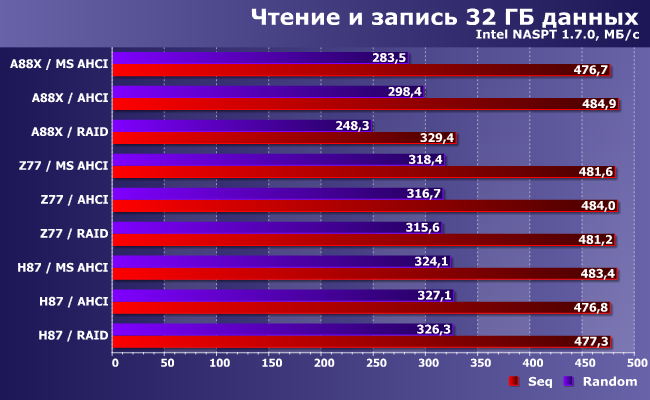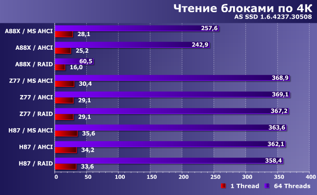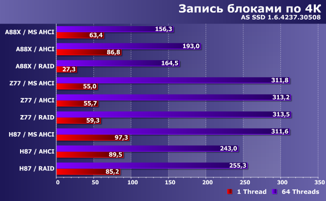 Вот тест скорости записи оказался весьма интересным. Некоторые закономерности сохранились: SATA-контроллер AMD ведет себя по-разному в AHCI- и RAID-режиме, а у Intel такой «особенности» нет. В AHCI-режиме драйвер Microsoft снижает производительность A88X, но оказывается более быстрым на H87, а Z77 абсолютно все равно. К последнему, впрочем, мы были морально готовы: как уже говорилось выше, использовался более старый пакет ПО Intel, нежели чипсет, так что тут возможно всякое. Хорошо заметно также и то, что программная часть в основном влияет на работу в «нагруженном режиме», несколько выходящем за рамки «обычного использования» компьютера, что будет интересно только любителям бенчмарков с последующим «мерянием»... результатами в форумах — тут удачный (или, напротив, не очень) выбор драйвера может сильно изменить картину. А при тестировании с единичной очередью первоочередными являются собственно характеристики накопителя и контроллера — зависимость от драйвера здесь несравнимо меньше.