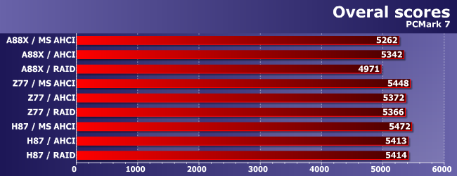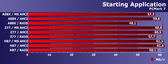 Разброс значений на разных трассах PC Mark 7 не превышает 10%, что вполне объяснимо тем, что задействовать возможности современных SSD данный пакет может разве что в RAW-режиме, когда не пытается имитировать реальную нагрузку с учетом прочих компонентов компьютера. Выделилась только наша «любимая» трасса запуска приложений, где, кстати, RAID-режим оказался самым медленным у всех контроллеров. Но практически значимым это замедление является только для А88Х, что уже не удивляет.