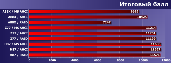 Собственно, для целей статьи хватило бы и одной этой диаграммы — остальные нужны для того, чтобы понять, как она такая получилась :) Как видите, в любом (даже наихудшем) случае быстрый твердотельный и механический накопители — это два разных непересекающихся мира. (Напомним, что HDD по условиям конкурса выдает ровно 1000 баллов.) А вот при одинаковом накопителе начинает сказываться и контроллер, с учетом режима его работы и конкретного драйвера. Впрочем, в случае чипсетов Intel AHCI-режим есть лишь подмножество RAID (без собственно «массивов»), да и между драйверами особой разницы не наблюдается — ПО Intel можно устанавливать, а можно не устанавливать, по вкусу. В RAID-режиме как минимум драйвер использовать придется, но без этого режима вполне можно обойтись: самый простой и удобный для пользователя (и выбираемый системными платами по умолчанию) режим AHCI со стандартным системным драйвером работает не хуже (и не лучше), так что все остальные нужны только тогда, когда пользователь точно знает, зачем. При этом включение RAID-режима просто «чтобы было» тоже ни к каким проблемам не приведет.