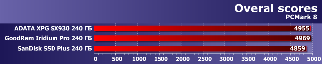 PCMark 8 оперирует комплексными нагрузками, учитывая быстродействие не только собственно накопителей, но и других компонентов компьютера, так что в общем и целом его оценки для SATA SSD различаются незначительно. Хорошая, в сущности, новость для тех, кто присматривается к недорогим устройствам.