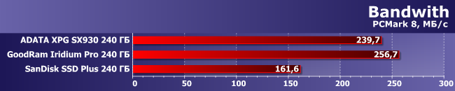 Что касается оценки «полосы пропускания», которая в большей степени привязана собственно к устройству, а не ко всей системе, то тут уже SSD Plus отстает от остальных участников в полтора раза, а самым быстрым (из протестированных нами) накопителям этого класса уступает почти вдвое.
