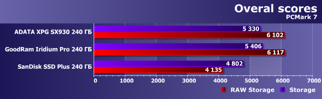 Трассы PCMark 7 «легче», чем у потомка, благо и сам тестовый пакет ориентирован в большей степени на более старые системы и программное обеспечение, так что в данном случае от накопителя зависит больше. Со всеми вытекающими отсюда последствиями для SSD Plus. Особо обратим внимание на то, что в его случае «низкоуровневая» оценка ниже «основной», что как раз традиционно для медленных устройств.