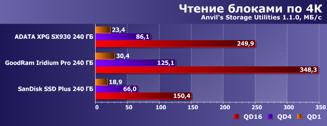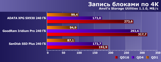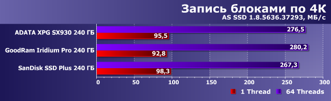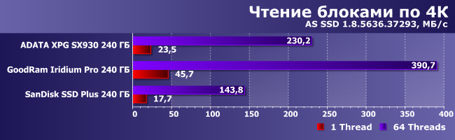 При первом тестировании слабым местом AData XPG SX930 являлись запись и чтение «в один поток». Обновление тестовой методики показало, что проблема была, пожалуй, не его, а несколько более комплексной, так что на этот раз оказалась куда менее выраженной. И вообще — бывает и хуже. Причем, что примечательно, как и в случае последовательных операций, SanDisk SSD Plus не слишком успешно выступает при чтении данных. С записью дела обстоят немного лучше.
