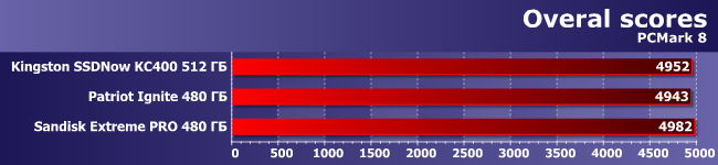 Как и следовало ожидать, PCMark 8 «не видит» разницы между тремя однотипными устройствами вообще. Это как раз то, о чем было сказано выше — в принципе многим покупателям уже вполне достаточно информации о том, что в их компьютере установлен твердотельный накопитель, емкостью порядка полутерабайта. Собственно, даже тип используемой памяти (MLC и TLC) вряд ли окажется значимым, если подходить к вопросу «с пристрастием», не говоря уже о более тонких нюансах.