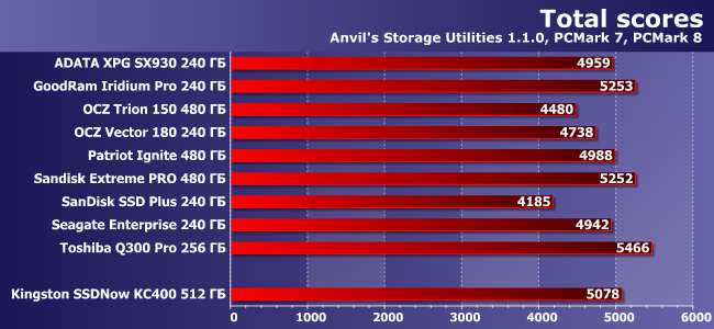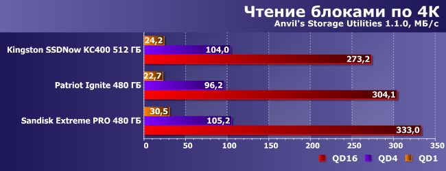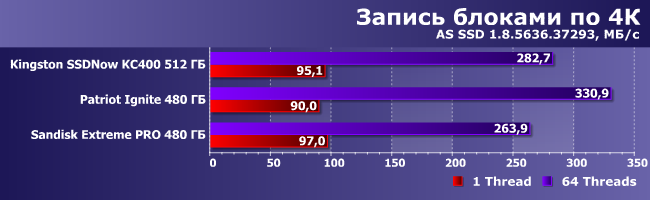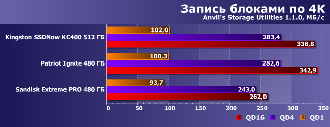 Как уже не раз было сказано (и показано), какие-то изменения на таких нагрузках возможны только путем смены интерфейса — SATA600 для всех современных SSD уже «узковат». При записи данных, впрочем, бюджетные устройства могут еще сами по себе оказаться медленноватыми, но уже в среднем массовом сегменте такого не наблюдается.