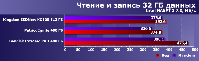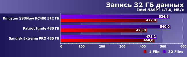 На данный момент нами протестировано не слишком много накопителей сопоставимой емкости, поэтому мы решили ограничиться для сравнения двумя моделями: Patriot Ignite 480ГБ (с нашим героем его роднят емкость и контроллер, а вот цена у него ниже, благодаря использованию 16-нанометровой памяти MLC Micron с асинхронным интерфейсом) и Sandisk Extreme Pro 480 ГБ (его тоже «любят» те, кто обращает внимание на срок гарантии, да и сам накопитель весьма быстрый, но достаточно дорогой).