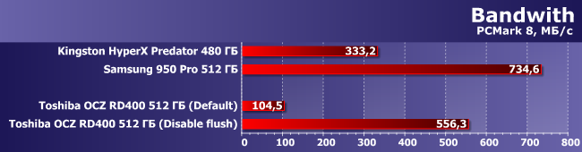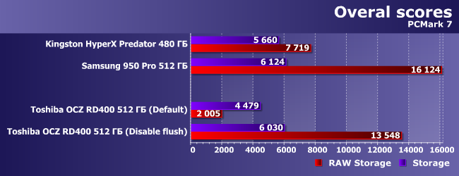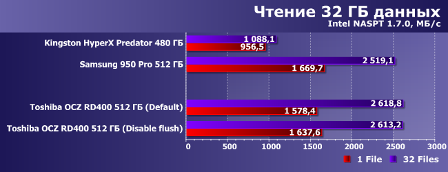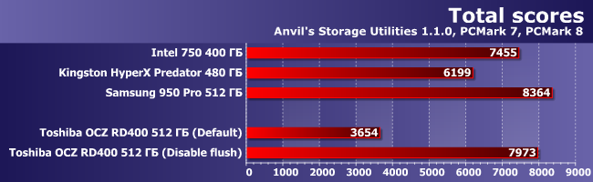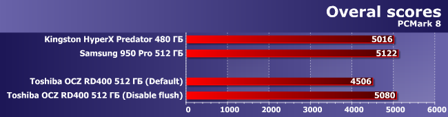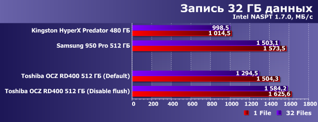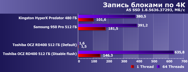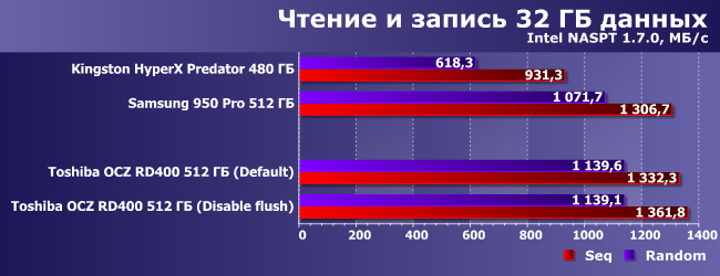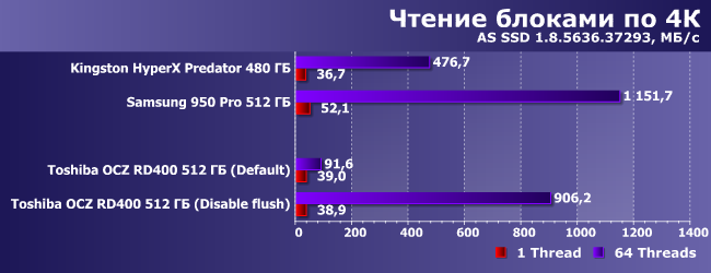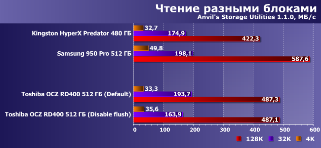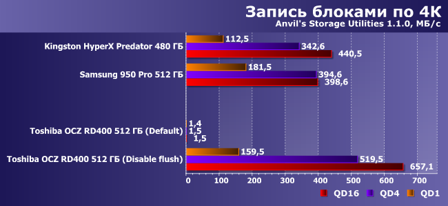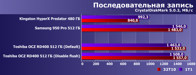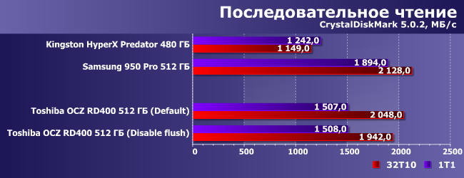 | Kingston HyperX Predator 480 ГБ | Samsung 950 Pro 512 ГБ | Toshiba OCZ RD400 512 ГБ (Default) | Toshiba OCZ RD400 512 ГБ (Disable flush) | |