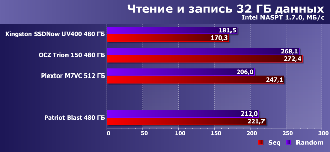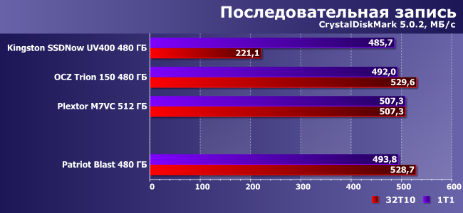 | Patriot Blast 480 ГБ | Kingston SSDNow UV400 480 ГБ | OCZ Trion 150 480 ГБ | Plextor M7VC 512 ГБ | |