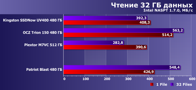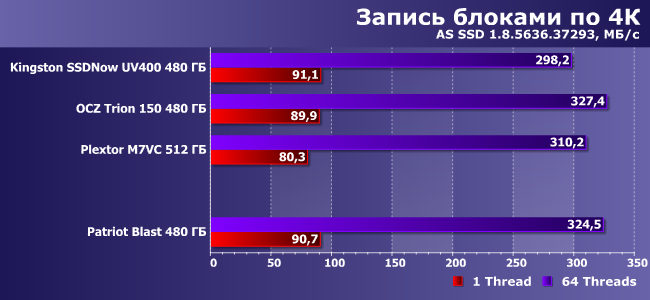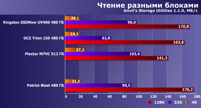 | Patriot Blast 480 ГБ | Kingston SSDNow UV400 480 ГБ | OCZ Trion 150 480 ГБ | Plextor M7VC 512 ГБ |