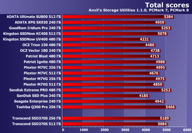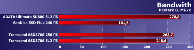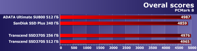 Как и следовало ожидать (да и давно стало привычным), «в попугаях» PCMark 8 все накопители имеют одинаковую «длину» — разве что SSD Plus немного медленнее других участников.