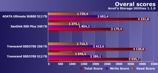 | AData Ultimate SU800 512 ГБ | SanDisk SSD Plus 240 ГБ | Transcend SSD370S 256 ГБ | Transcend SSD370S 512 ГБ |