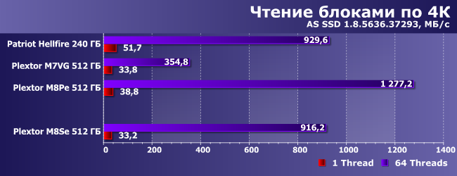 Но в прикладном ПО на данный момент все же чаще встречается чтение, причем и блоками больше 4К, но с единичной очередью команд (более длинная в массовом персональном компьютере просто «не успевает собраться»). И в таких сценариях производительность M8Se не рекордная, но, в общем-то, чуть более высокая, чем у SATA-накопителей с тем же типом памяти. Так что и в этом сегменте какой-никакой выигрыш от перехода на новые интерфейсы есть.