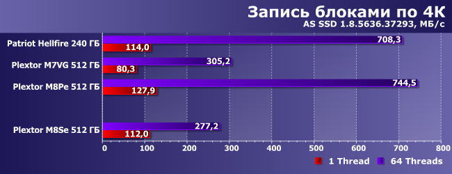 Результаты M7V можно не принимать во внимание: при таких нагрузках интерфейс имеет решающее значение, а пропускная способность SATA600 давно уже «выбрана» полностью. В остальном никаких неожиданностей: при чтении M8Se примерно эквивалентен M8Pe — как и должно быть.