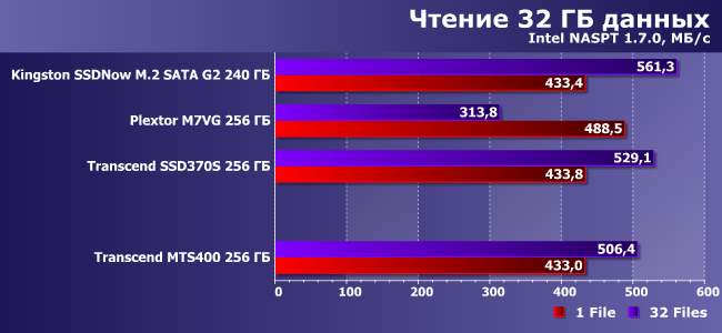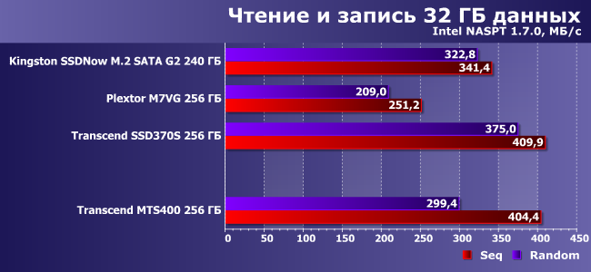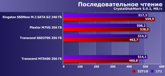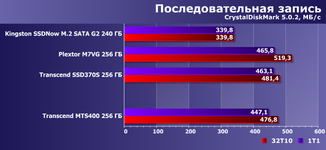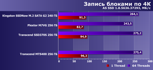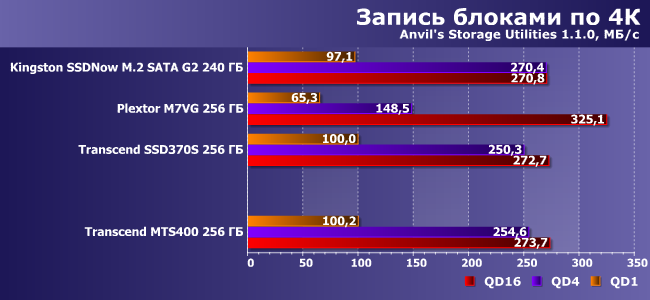 Словом, все «как у взрослых». А есть ли отличия в работе? Вот это мы и решили проверить — благо SSD370S той же емкости был протестирован ранее. Также для оживления пейзажа мы воспользовались и результатами Kingston SSDNow M.2 SATA G2 240 ГБ и Plextor M7VG 256 ГБ, благо это тот же класс и та же емкость. Но аппаратная база немножко разная.
