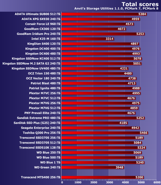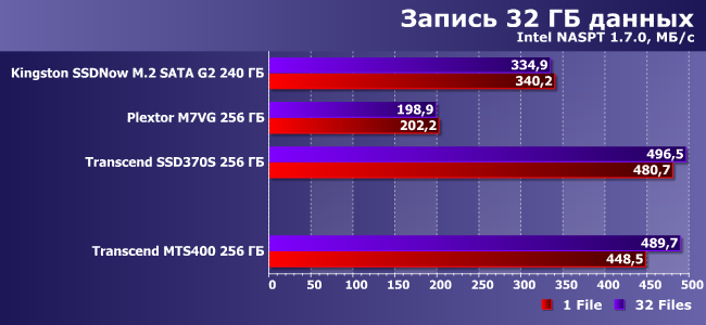 В принципе, главным для нас сейчас является то, что оба накопителя Transcend ведут себя одинаково с точностью для погрешности измерения. И оба соответствуют априорным ожиданиям от SSD с SATA-интерфейсом. А более подробные выводы пока отложим — до шаблонов с большим объемом данных, где перестает действовать SLC-кэширование и подобные механизмы.