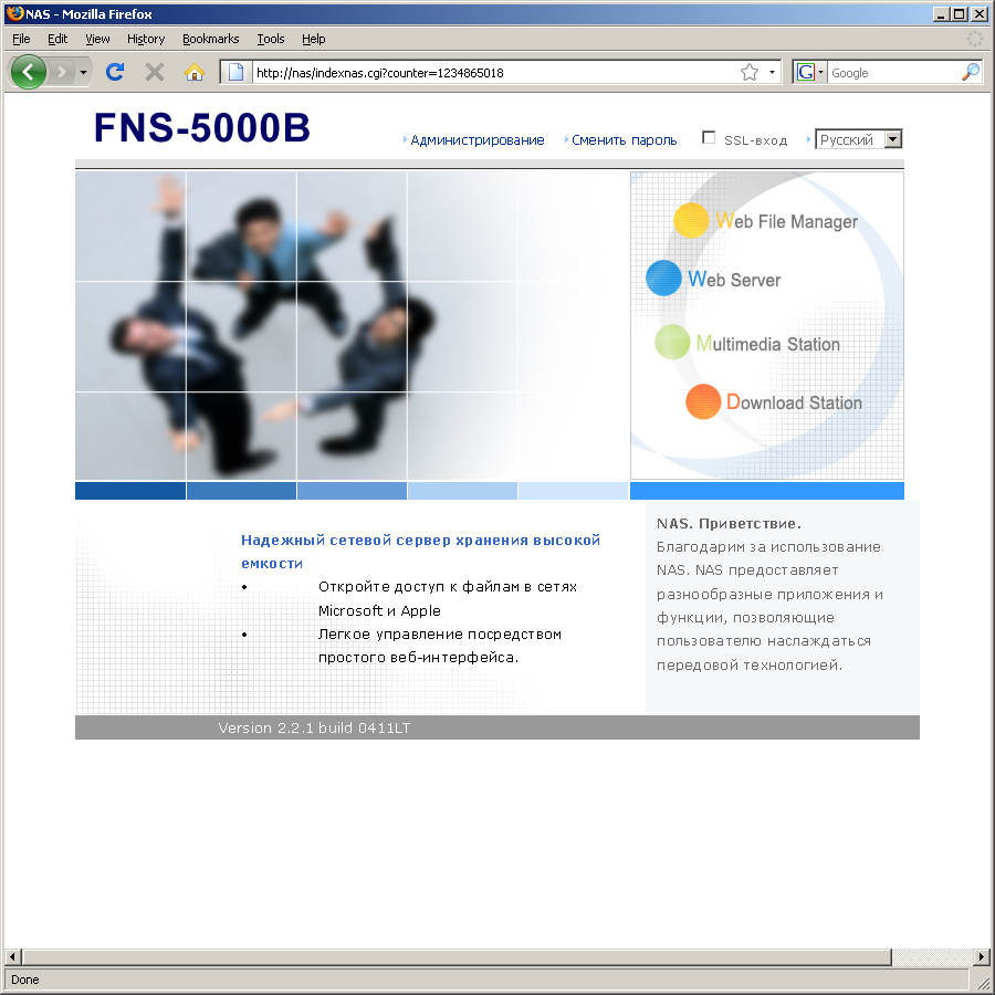Web-интерфейс, как и подобает настоящему клону, аналогичен другим моделям QNAP. Однако по сравнению с ранее рассмотренной топовой моделью TS-509 Pro возможностей конечно меньше. На первой странице представлены доступные из браузера сервисы (администрирование, система управления файлами, станция загрузки файлов и другие), меню с выбором языка (русский присуствует) и чекбокс использования шифрованного соединения (SSL). Интерфейс работает с номером порта 8080 и поменять его нельзя.