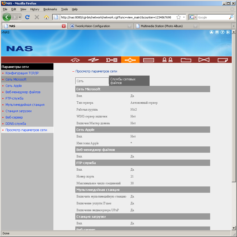 Вторая группа («Параметры сети») отвечает за сетевые настройки и поддерживаемые протоколы. Кроме установки IP-адреса (ручной или DHCP-режим) можно включить Jumbo Frames при работе в гигабитной сети (размер пакета — до 7418 байт) и активировать встроенный DHCP-сервер. Для сетей Microsoft можно выбрать имя рабочей группы, задать описание сервера и установить адрес сервера WINS. Для AppleTalk — только выбрать зону. У сервера FTP тоже немного настроек — номер порта, максимальное количество одновременных подключений, поддержка Unicode и разрешение анонимных подключений. При использовании Unicode с русскими именами файлов все работает корректно. А вот при отключении данного режима возможны проблемы с доступом по FTP. Скорость работы заметно меньше чем по SMB/CIFS — около 6 МБ/с на запись и 12 МБ/с на чтение. Отметим, что все протоколы и сервисы можно независимо включать/выключать. Из мультимедийных сервисов присутствуют «Мультимедийная станция», сервер iTunes и TwonkyVision. Подробнее мы рассмотрим далее. Web-менеджер файлов и станция загрузки имеют только возможность включения, а у Web-сервера дополнительно можно выбрать порт. В этой же группе находится страница для настройки встроенного клиента DDNS, поддерживающего пять провайдеров. Как и у системных настроек, здесь есть справочная страничка, на которой можно быстро узнать сетевые адреса и состояние всех сервисов.