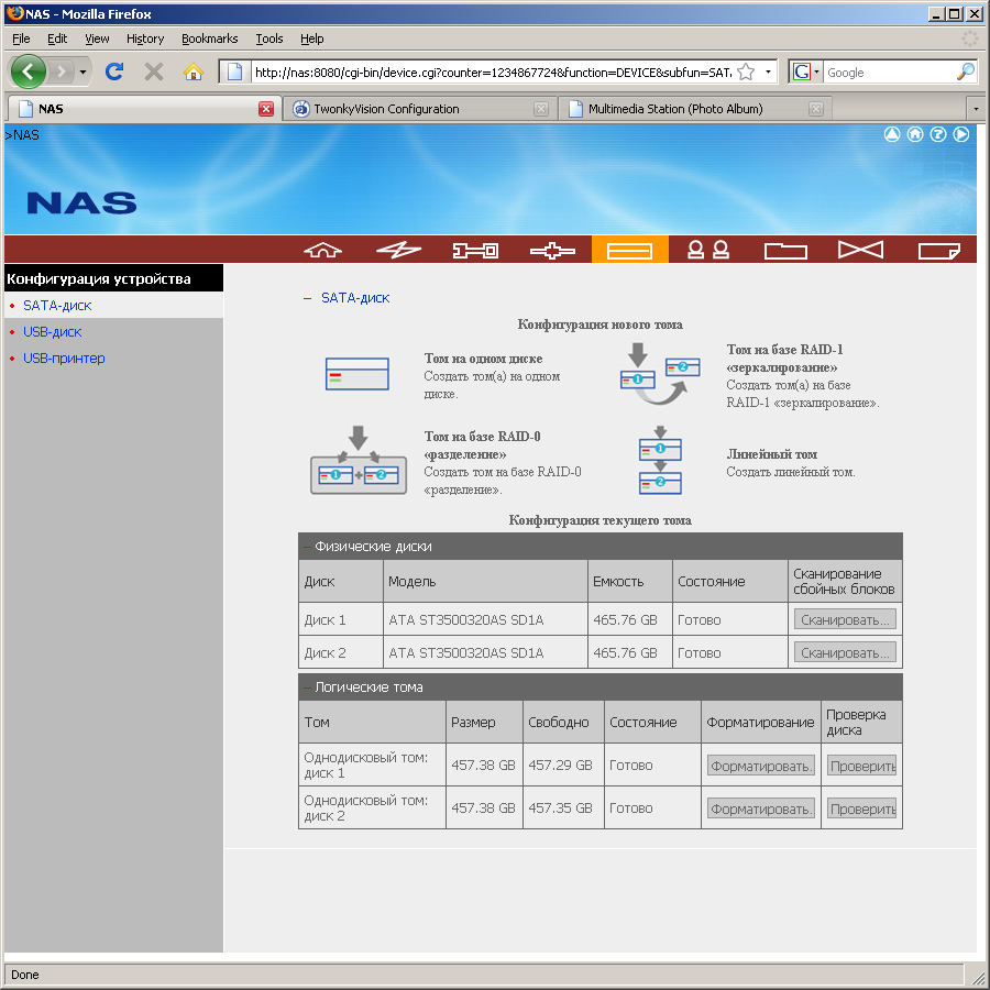 Третья группа («Конфигурация устройства») используется для работы со встроенными жесткими дисками и внешними устройствами (накопителями и принтером). Для дисков допустимы любые режимы — два отдельных диска, линейный том, массивы RAID0 и RAID1. Система управления ими достаточно простая, несколько смущает только отсутствие выделенного пункта «Удалить массив». Эта операция происходит автоматически при создании нового тома. Для винчестеров есть операция проверки на сбойные блоки, а для томов — форматирование и сканирование файловой системы. Внешние накопители с интерфейсом USB можно подключать через хаб. Поддерживаются файловые системы FAT, NTFS (только чтение), EXT3. Предусмотрено форматирование внешних устройств в FAT и EXT3 встроенными средствами. Для каждого устройства создается отдельный сетевой ресурс (с нумерацией по порядку подключения). На жестких дисках виден только первый раздел. Права доступа по-умолчанию — чтение для всех, полный доступ администратору. Если их поменять, то они сохраняются после переподключений (правда с привязкой именно по номеру, то есть удобно так делать только если есть постоянно подключенное устройство). Интересно, что по FTP эти ресурсы не видны. Связь с принтером как обычно односторонняя, тестовый Canon MP510 работал успешно.