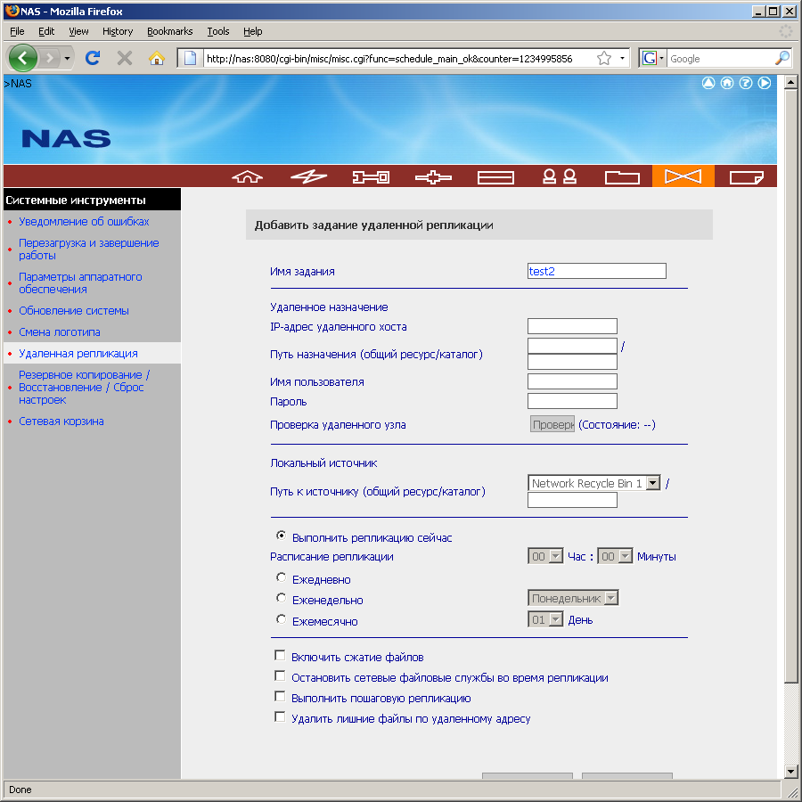 Предпоследняя группа настроек называется «Системные инструменты». Здесь пользователь может настроить отправку сообщений на e-mail (три уровня важности, до двух адресов, сервер SMTP может быть с авторизацией, но без шифрования, предусмотрена отправка проверочного сообщения), перезагрузить или выключить накопитель, установить несколько системных параметров (наиболее интересные — автоматическое выключение дисков в случае отсутствия активности и автовключение при восстановлении питания после отключения), конечно обновление прошивки и сохранение/восстановление/сброс конфигурации, смена одного из изображений на странице приветствия, включение корзины для удаленных файлов (одна общая для всех папок на каждом томе, при удалении файлов через FTP не работает) и удаленная репликация. Последний пункт служит для синхронизации локальных ресурсов с удаленными сетевыми папками. Поддерживается работа по расписанию и сжатие. К сожалению у нас эта функция не заработала (устройство не смогло подключиться к удаленной папке).