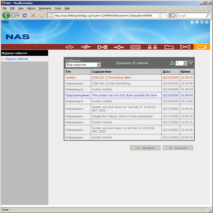 Ну и последняя страница, представленная в одиночестве, — список системных событий. Отметим, что он не очень подробный и в основном отображает что-то действительно серьезное, как например создание или удаление тома.