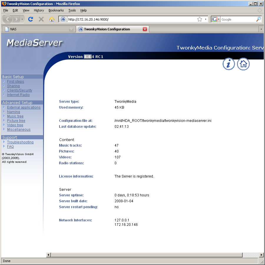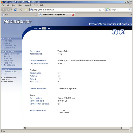 DLNA-сервер более интересен. Он построен на базе одной из наиболее функциональных программ — TwonkyMedia. Причем в данном случае используется полная версия программы, в отличии от 30-дневных триал-версий, встречающихся у других моделей сетевых накопителей. Доступ к настройкам сервера можно получить через браузер и 9000-й порт. Для проверки форматов мы использовали программы Cyberlink SoftDMA и Windows Media Player 11. Однако отметим, что ограничения могут появиться и из-за клиента. Изображения могут быть в любом актуальном формате — jpg, bmp, png, tif, gif. С музыкой тоже все неплохо — mp3, wma, aac, mp4, wav, ogg, flac. Наши плееры без подготовки смогли проиграть конечно только первые два варианта. Зато теги на русском языке в них отображались корректно. Наиболее интересный список форматов получился для видео — avi, mp4, mwv, mpg, ts, mov, m4v, m2ts.