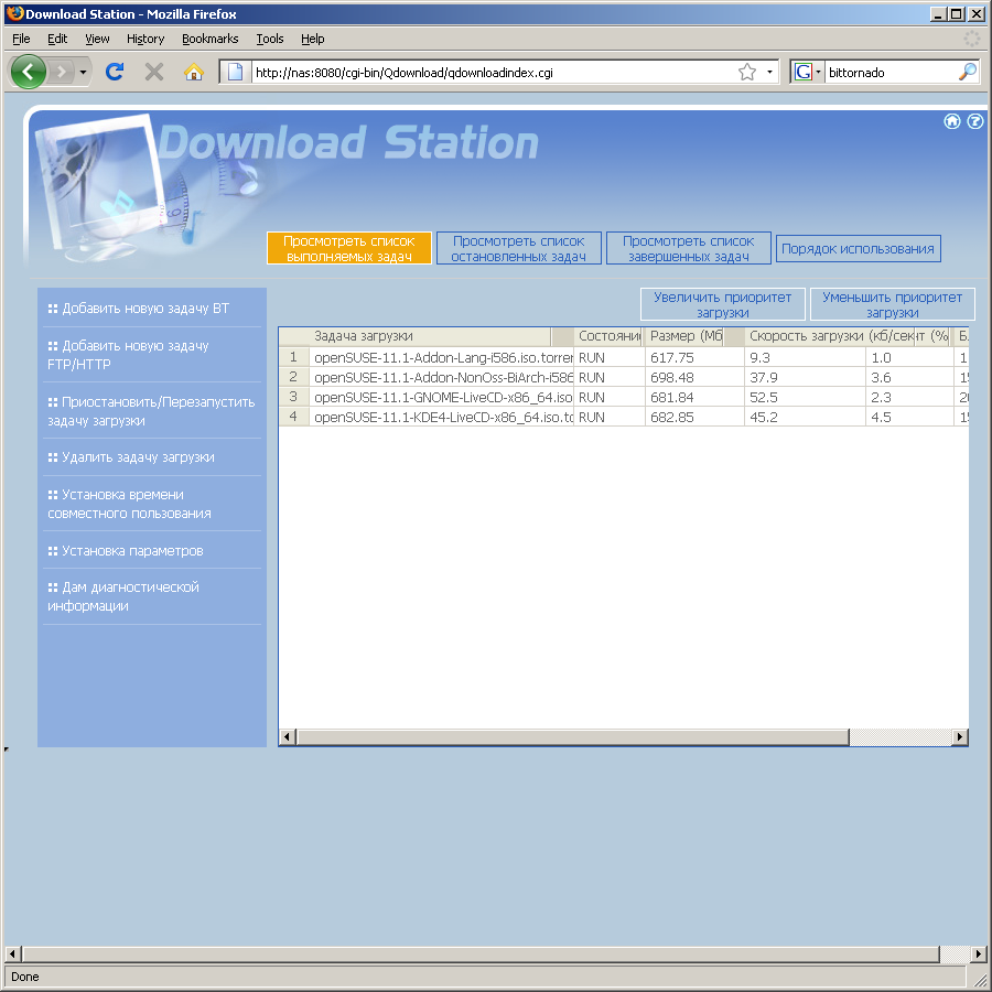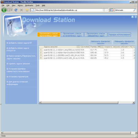Станция автономной загрузки файлов поддерживает кроме BitTorrent и протоколы FTP и HTTP. Причем для последних во время создания задания, можно указать имя пользователя и пароль, а также общую папку, куда записывается файл. Что касается клиента BitTorrent, то мы были неприятно удивлены его внешним видом, после рассмотрения аналогичного на оригинальной модели QNAP. Окно с заданиями совершенно невозможно использовать — столбцы имеют непонятный размер и содержание, понять в каком состоянии каждая задача нельзя, сколько раздали и какой рейтинг — тоже. Хорошо хоть есть настройки портов, скоростей и максимального числа задач (до 10). Загруженные файлы можно раздавать до 1024 часов (этот параметр можно установить для каждого торрента отдельно). Если задача «закончилась», то можно ее удалить, и загрузив снова сам торрент-файл заново запустить на раздачу. Еще одной неприятностью стала блокировка клиента на некоторых трекерах (впрочем это можно относительно легко исправить). Хотя с другой стороны файлы закачиваются и отдаются, так что для в большинстве случаев сервисом пользоваться можно, но до лучших представителей, работающих «из коробки», ему далеко.