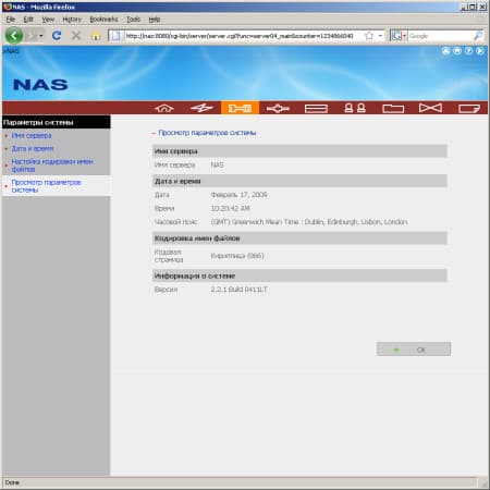Для более подробной настройки используются остальные семь групп страниц. На первой («Параметры системы») выбирается имя сервера, установки часов (возможна синхронизация через Интернет), задается кодировка имен файлов для старых сетевых клиентов (не поддерживающих Unicode). Здесь же можно на одной странице быстро проверить все указанные настройки.