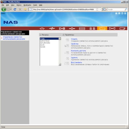 Настройка общих папок также проста — выбирается имя, комментарий, расположение (в случае использования двух отдельных томов). Доступа программируется для отдельных пользователей или групп. Возможные варианты — нет доступа, только чтение, чтение и запись. В случае, если пользователь не имеет доступа к папке, то по сети он может увидеть ее имя. При подключении по FTP в корне отображаются только доступные ему ресурсы.