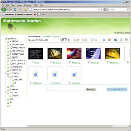 Из мультимедийных функций предусмотрены — просмотр фото и загрузка видео через браузер, DLNA-сервер и сервер iTunes. Первая программа позволяет после ввода имени пользователя и его пароля получить доступ к папке Qmultimedia в специализированном браузере, который от описанного выше отличается возможностью увидеть превью фотографий и информацию EXIF. Причем пользователь задается в отдельной от основной на накопителе базе администратором. Возможны и некоторые операции с файлами и папками. Формально можно рассматривать данный функционал как фотоальбом начального уровня.